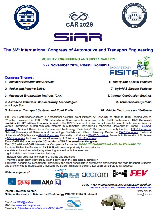 Ediția 2026 a Congresului Internațional CAR este dedicată temei INGINERIA MOBILITĂȚII ȘI SUSTENABILITATEA.